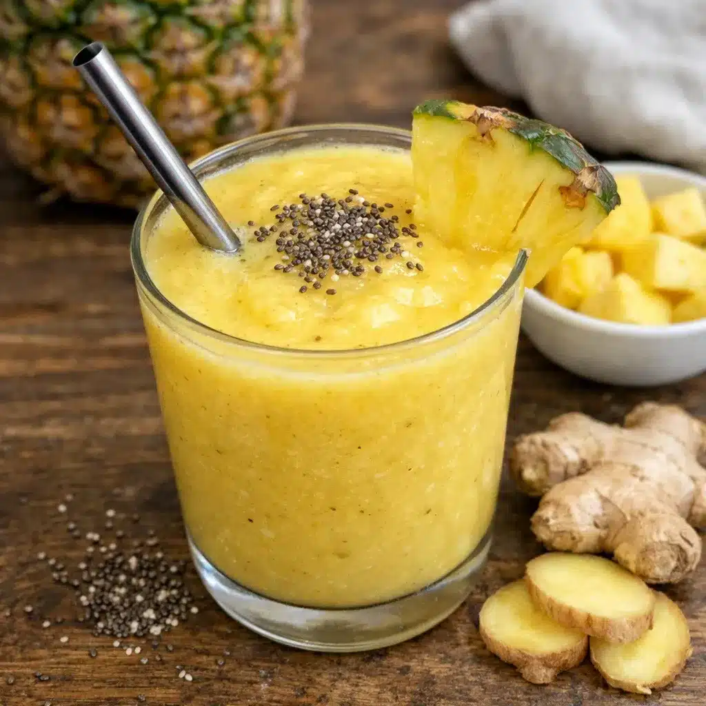 Fresh Pineapple Ginger Smoothie is a vibrant, refreshing drink packed with tropical flavor and a gentle zing from fresh ginger. The sweetness of pineapple blends perfectly with creamy yogurt and citrus notes, creating a smoothie that’s both energizing and refreshing. It’s quick to prepare, naturally nutritious, and perfect for breakfast, a midday boost, or a healthy snack.